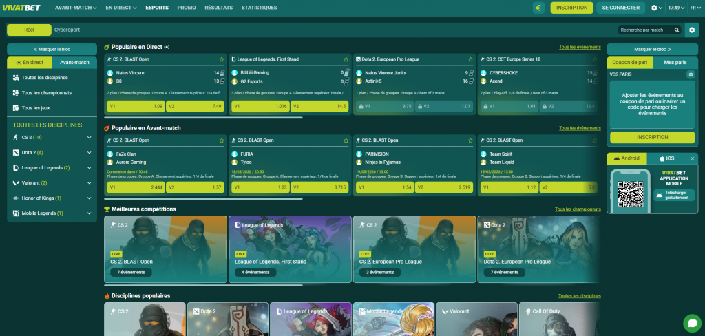 Là où le site marque vraiment sa différence, c’est par son focus sur l’e-sport : Dota 2, League of Legends, CS:GO sont proposés avec des cotes concurrentielles. La section Esports dispose même de sa propre rubrique dédiée dans le menu principal, avec des événements en direct comme le BLAST Open CS2 ou le First Stand League of Legends. Pour les parieurs qui cherchent un site de paris sportifs belge ouvert sur les nouvelles disciplines, Vivatbet paris sportifs est une référence.