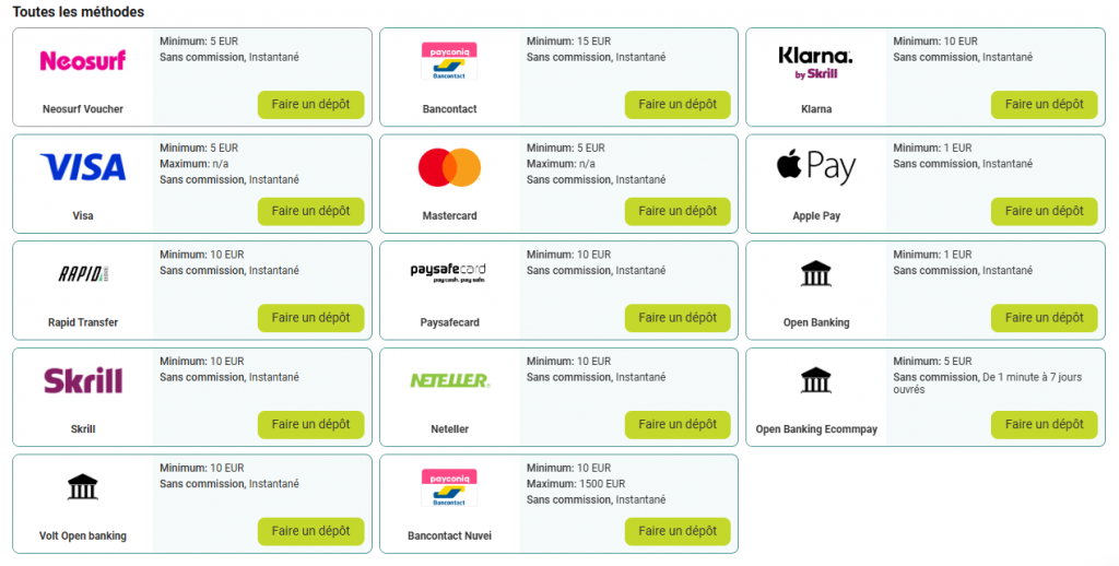 Vivatbet propose plusieurs options de dépôt et de retrait adaptées au marché belge :
